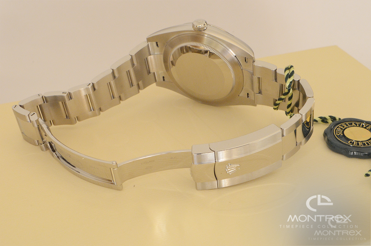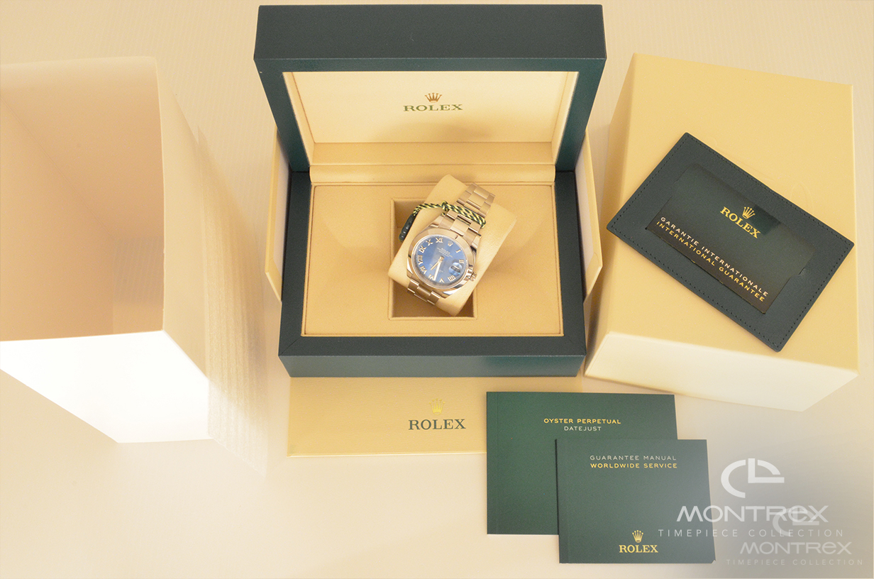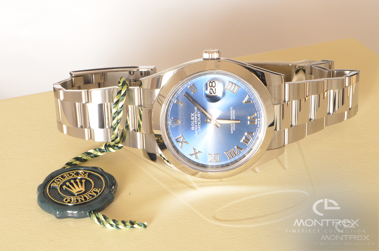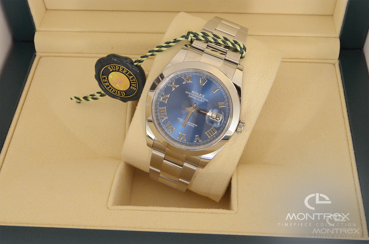 Rolex Datejust 41 référence 126300, jamais portée, cadran bleu, ensemble complet avec 5 ans de garantie du fabricant.
